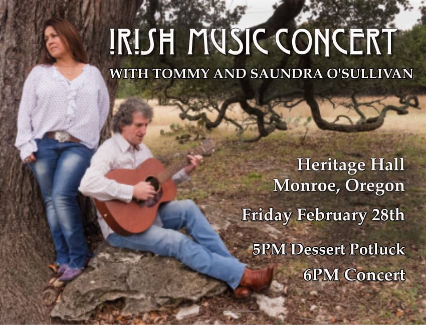 A concert of traditional and modern Irish music with Tommy and Saundra O’Sullivan will be at the Heritage Hall on February 28th.