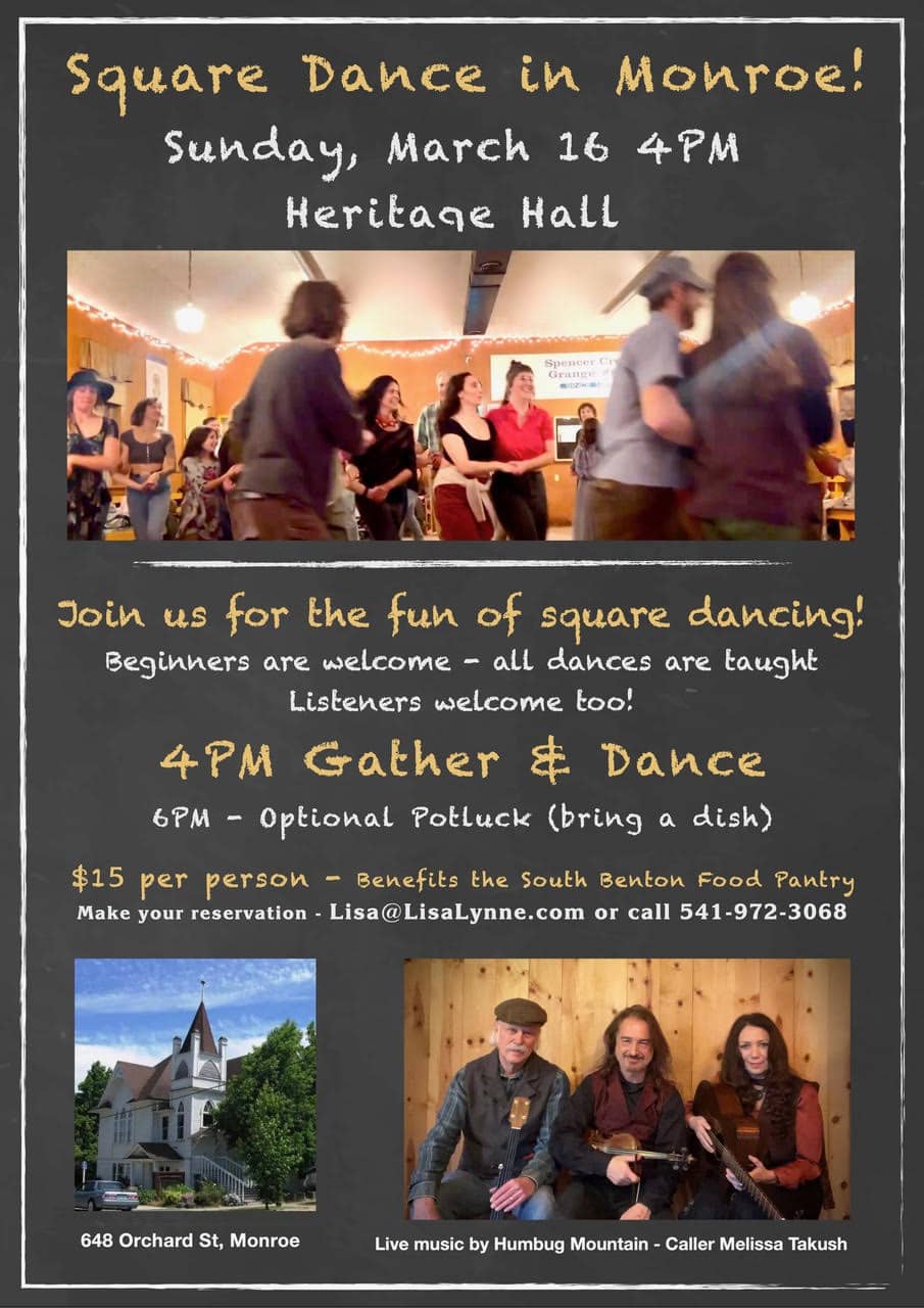 Enjoy live music from Humbug Mountain and calling by Melissa Takush, then stick around for a community potluck after the dancing! 🎻✨
